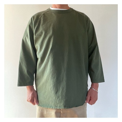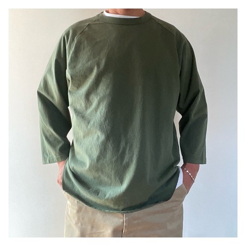 アメリカンクラシックな丸胴使いのデザインと、裾のラウンドカット、ラグランスリーブ、バインダーネックが特徴的な七分袖のTシャツです。