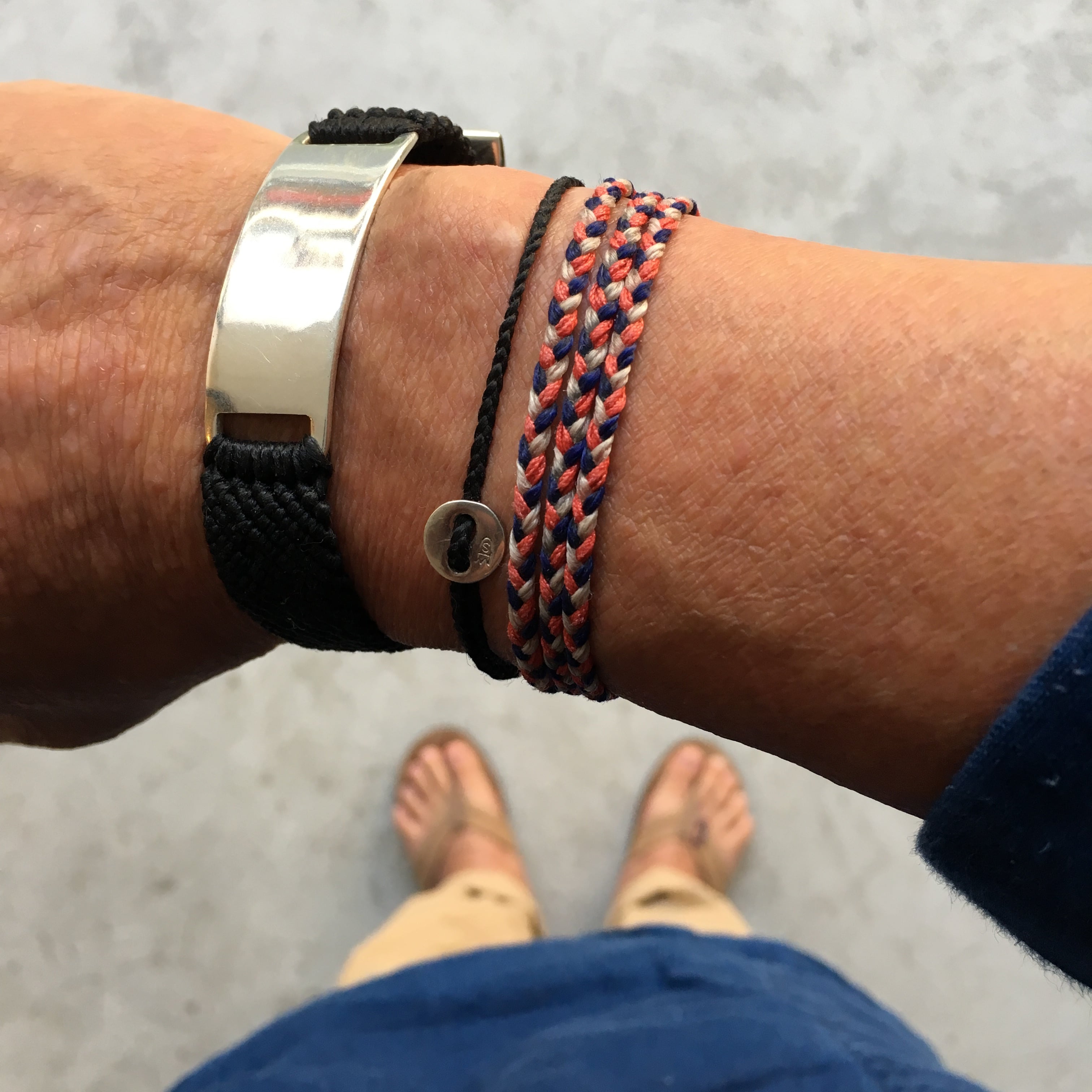 こちらは当店で別注をさせていただきました、星条旗(アメリカ)がイメージの三連ブレスレットです。ナイロンの紐を編み込んだ物にワックスコーティングを施し、シルバーの留め具を使用しています。留め具の部分にはSCOSHAのアイコンが刻印されています。